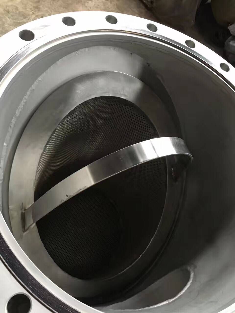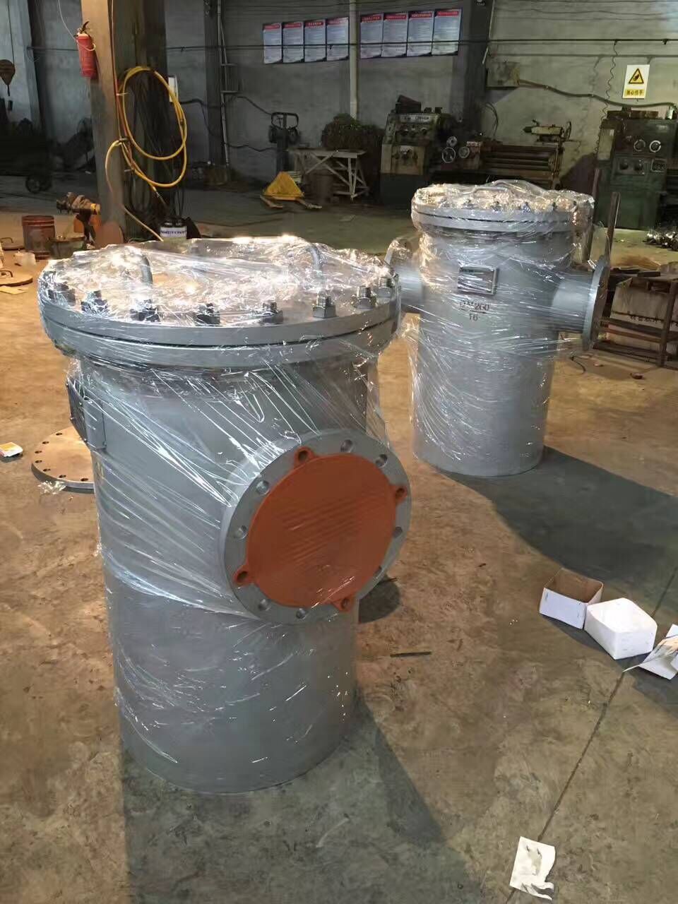 當液體通過筒體進入濾籃后,固體雜質顆粒被阻擋在濾籃內,而潔凈的流體通過濾籃、由過濾器出口排出。當需要清洗時,旋開主管底部螺塞,排凈流體,拆卸法蘭蓋,清洗后重新裝入即可。因此,使用維護極為方便。